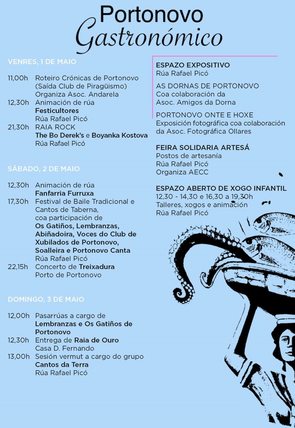 O venres 1 de maio, realizarase un Roteiro Crónicas de Portonovo coa Asociación Cultural Andarela. Da animación na rúa encargarase Festicultores, ás 12.30 horas, e, pola noite, a partir das 21.30, celebrarase o Raia Rock con The Bo Derek e Boyanka Kostova.