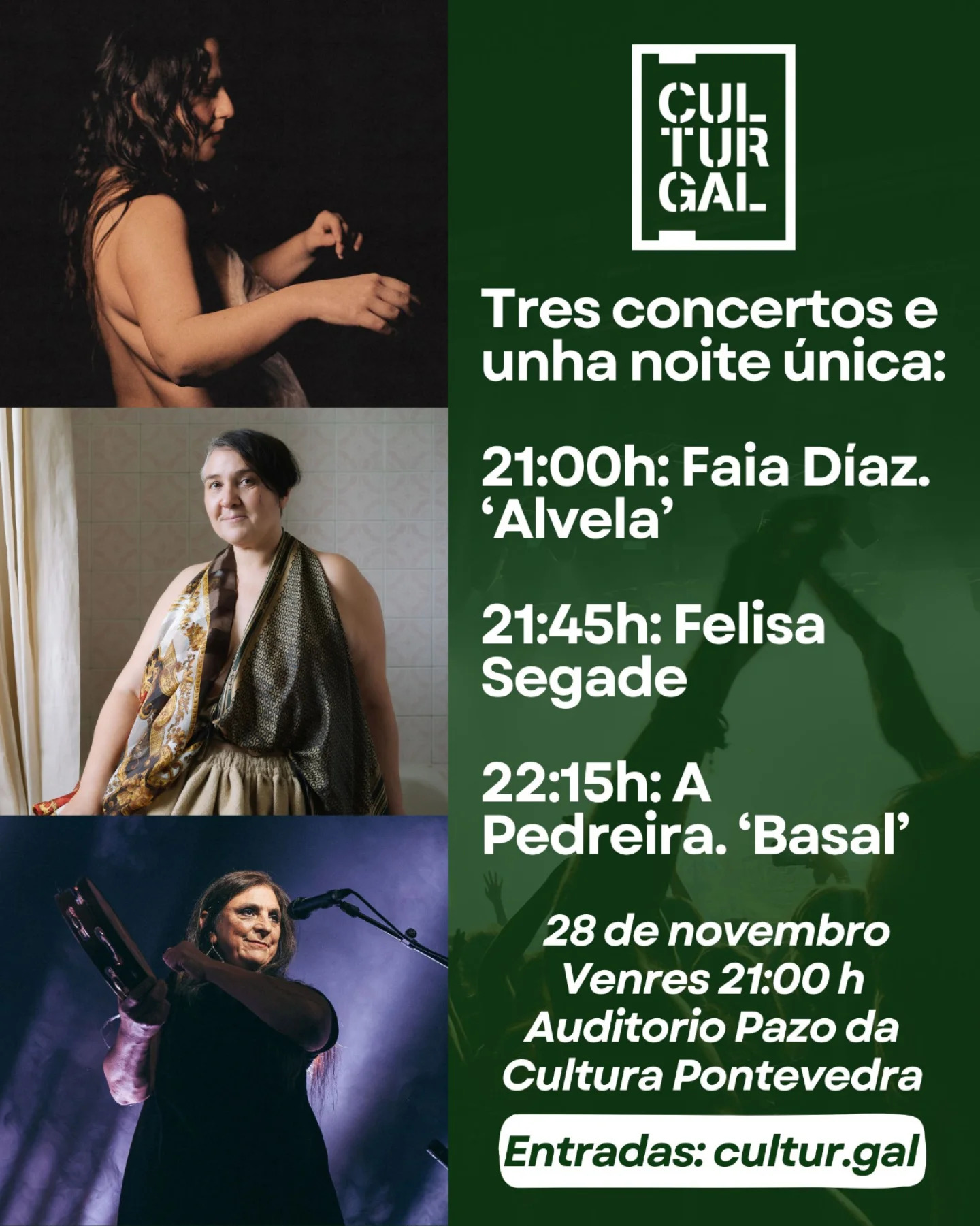 Faia Díaz, Felisa Segade e A Pedreira tomarán o escenario do Auditorio do Pazo da Cultura de Pontevedra.