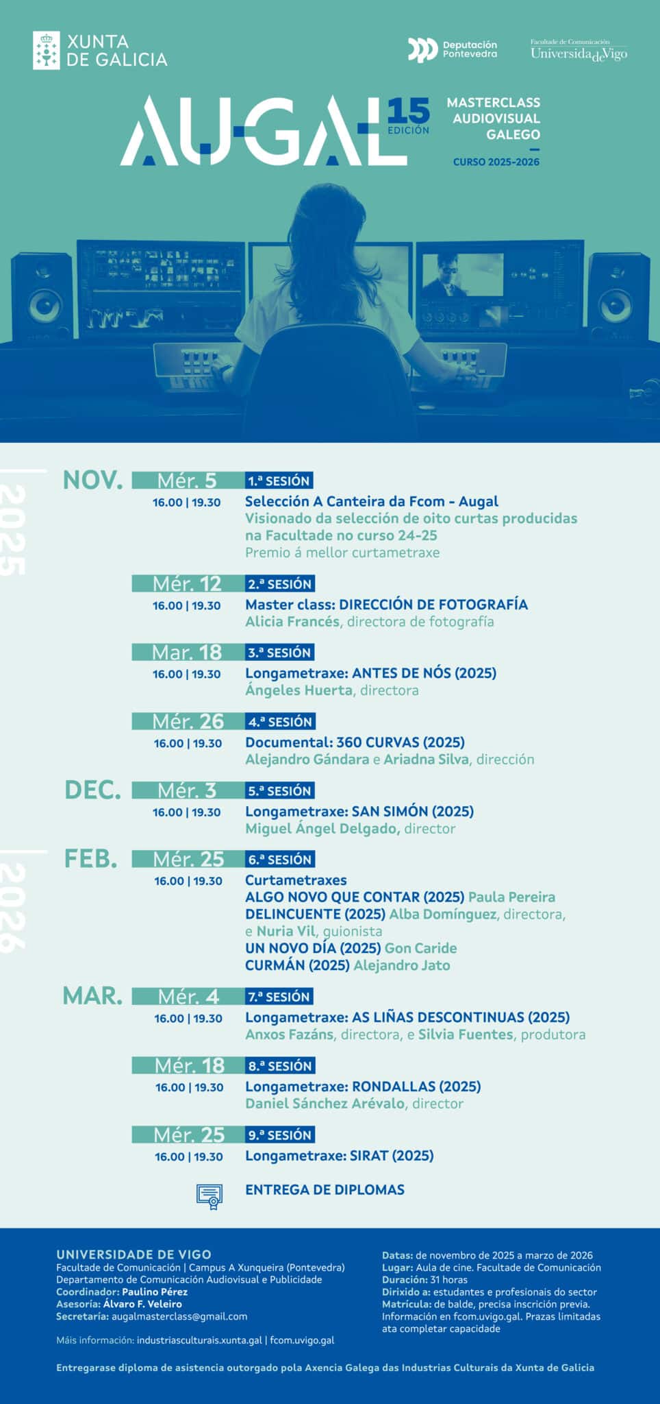 A Aula de Cine da Facultade de Comunicación acolle unha nova sesión da XV Máster Class Audiovisual Galego Augal, que este centro promove co patrocinio da Axencia Galega das Industrias Culturais (Agadic) e da Deputación de Pontevedra.