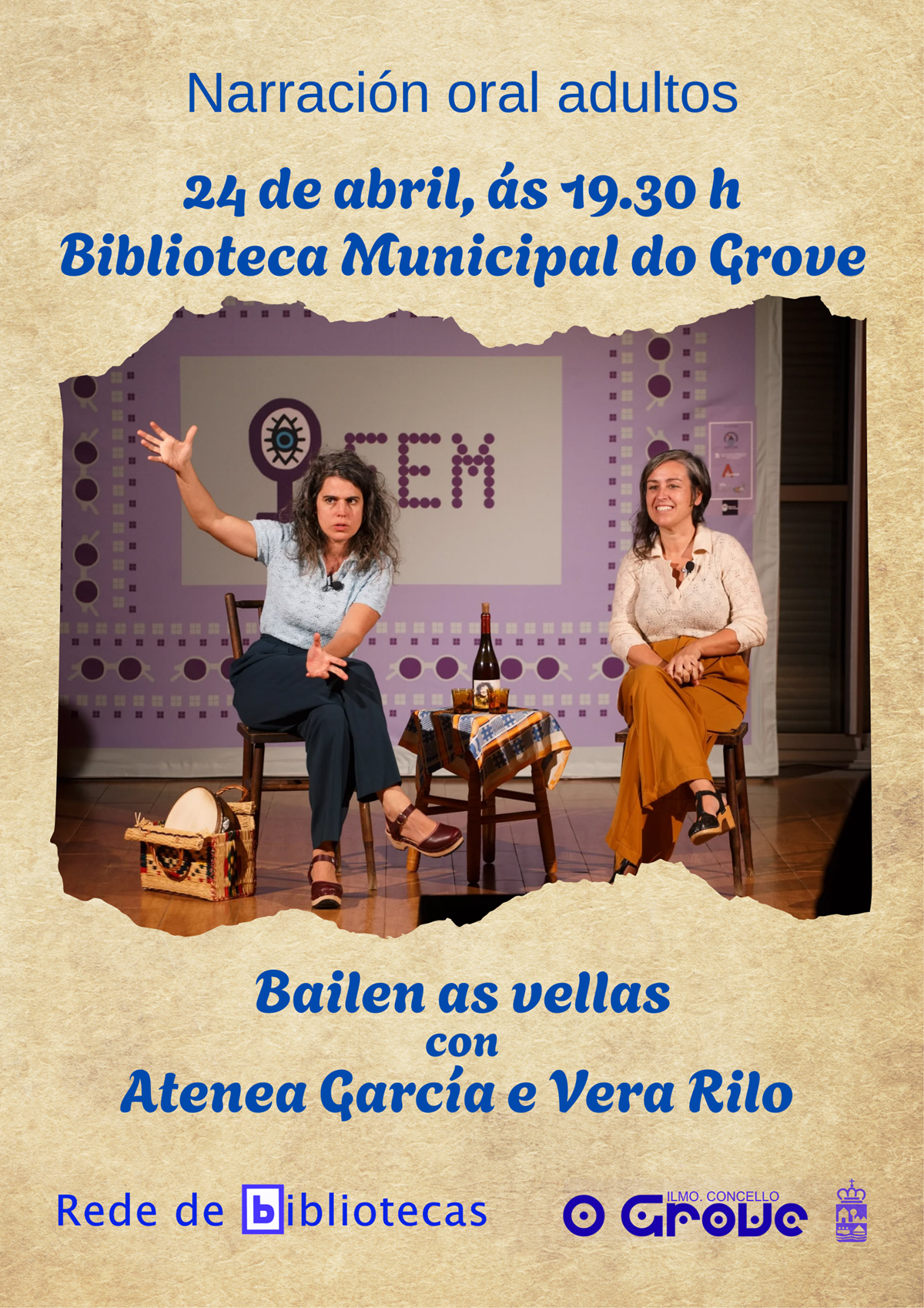 O venres 24 de abril, ás 19.30 horas, a Biblioteca Municipal do Grove acolle ‘Bailen as vellas. Os contos das cereixas’, un espectáculo de narración oral dirixido a público adulto a cargo de Atenea García e Vero Rilo.