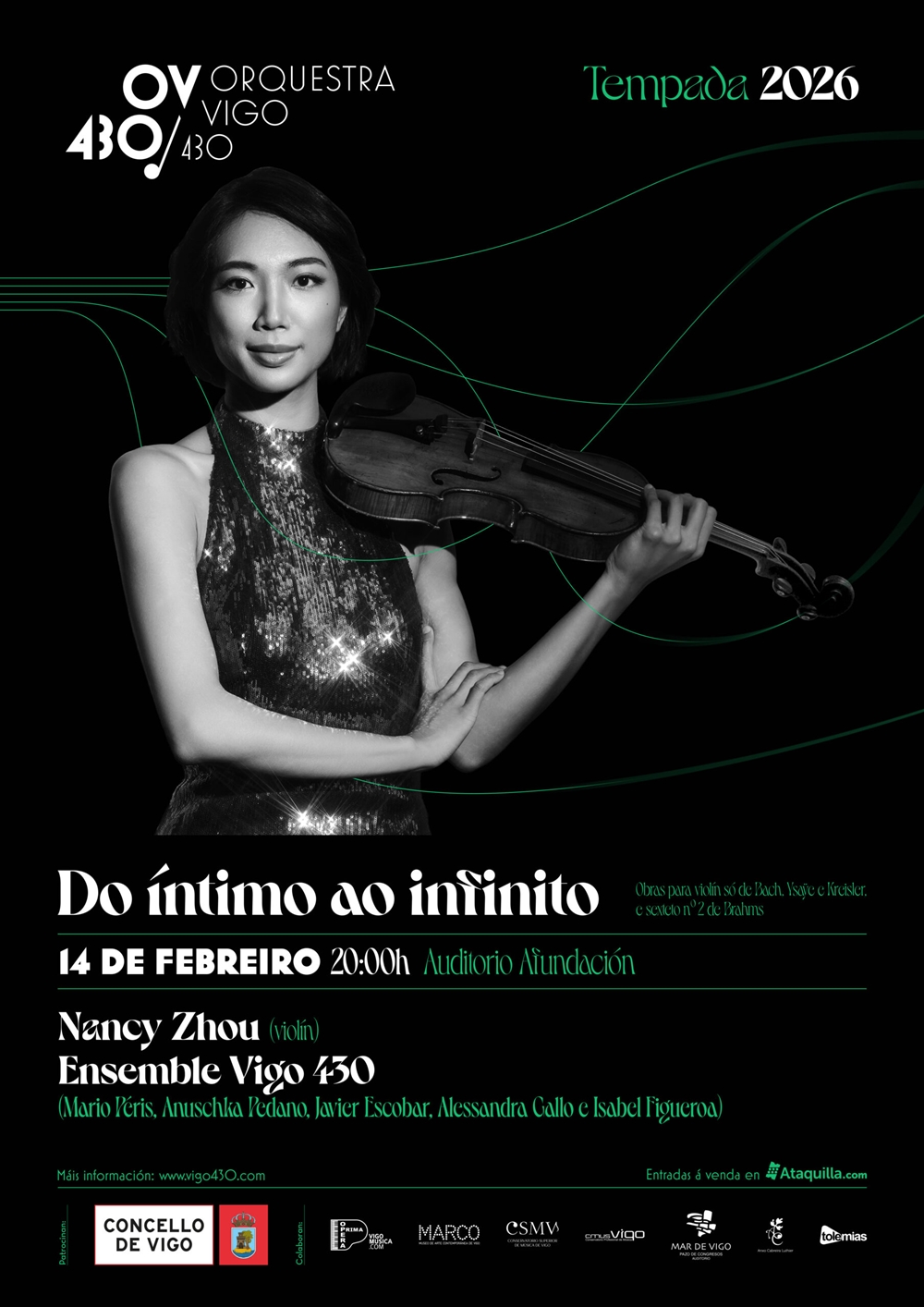 O 14 de febreiro no Auditorio do Teatro Afundación de Vigo, o concerto ‘Do íntimo ao infinito’ parte da soidade expresiva do violín —con obras de Bach, Ysaÿe e Kreisler— para culminar no Sexteto nº 2 de Brahms, interpretado por Nancy Zhou xunto ao Ensemble Vigo 430: Mario Peris (violín II), Anuschka Pedano (viola I), Javier Escobar (violaII), Alessandra Gallo (violonchelo I), Isabel Figueroa (violonchelo II).