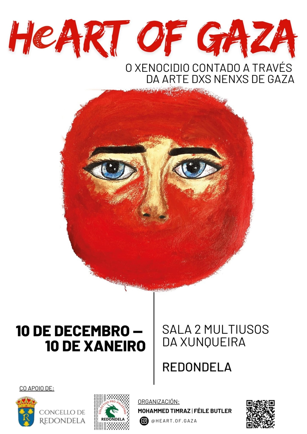 O Multiúsos da Xunqueira acolle desde o 10 de decembro ata o 10 de xaneiro a exposición ‘HeART of Gaza’. A mostra está organizada polo Colectivo ProPalestino de Redondela, en colaboración co Concello de Redondela e xa percorreu preto de 90 cidades de todo o mundo.
