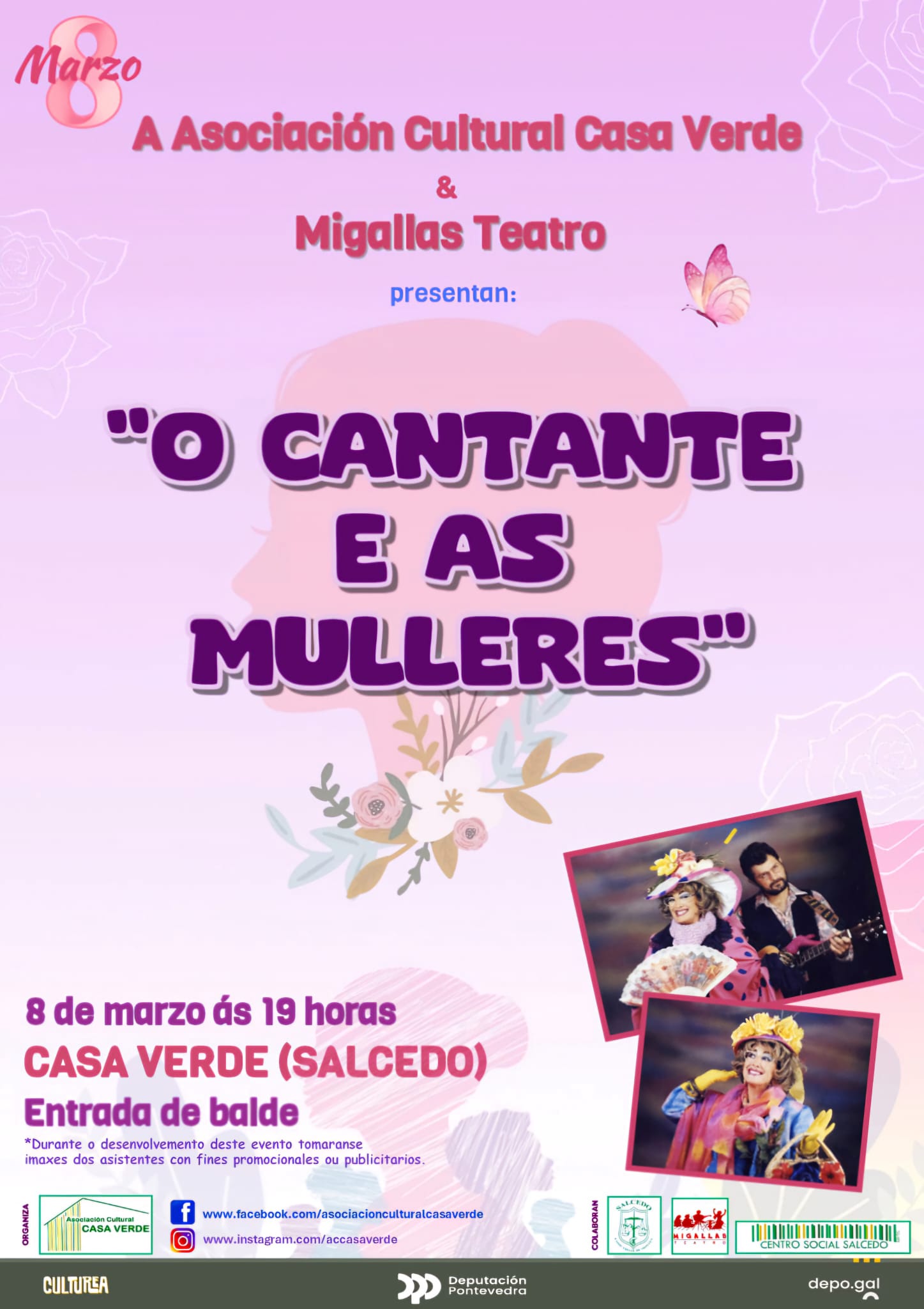 O domingo 8 de marzo, ás 19.00 horas na Casa Verde de Salcedo, a compañía Migallas Teatro representará o espectáculo ‘O cantante e as mulleres’ con motivo da celebración do Día Internacional da Muller.