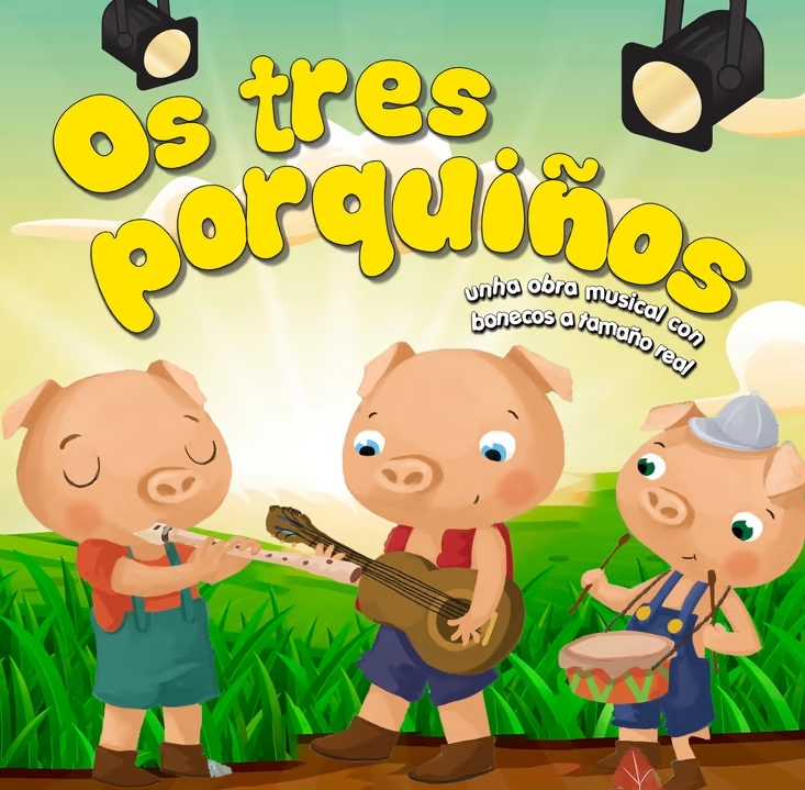 ‘Os tres porquiños’ é unha obra musical con bonecos a tamaño real. Unha revisión da tradicional fábula para adaptala aos novos tempos, incluíndo a figura de Xan e Xiana, dous exploradores moi afeccionados aos contos, que se adentran no bosque para coñecer os seus personaxes favoritos.
