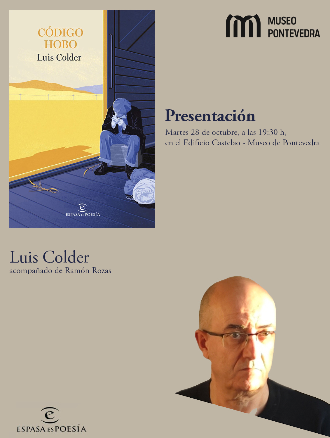 O martes 28 de outubro, ás 19:30 horas, no Edificio Castelao do Museo de Pontevedra, será presentado o poemario ‘Código Hobo’, pertencente á colección de poesía da Editorial Espasa.