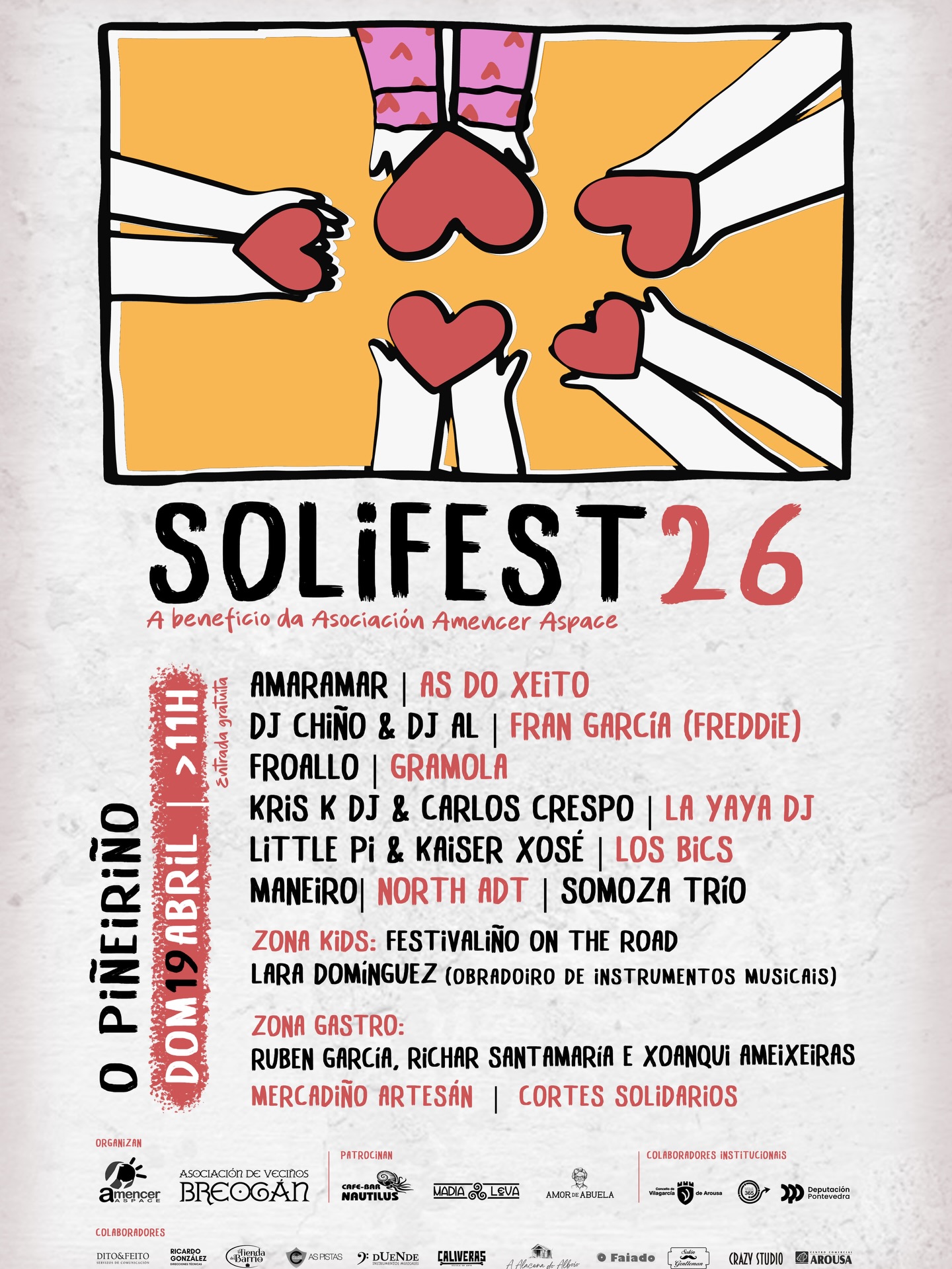 Solifest é moito máis que unha data no calendario, é o gran vermú solidario que une ao Barrio de O Piñeiriño e a toda Vilagarcía de Arousa cun propósito común. En este 2026, celebraremos con orgullo a terceira edición, consolidando un evento que naceu da ilusión e o compromiso compartido entre a Asociación de Veciños e Amencer-ASPACE.