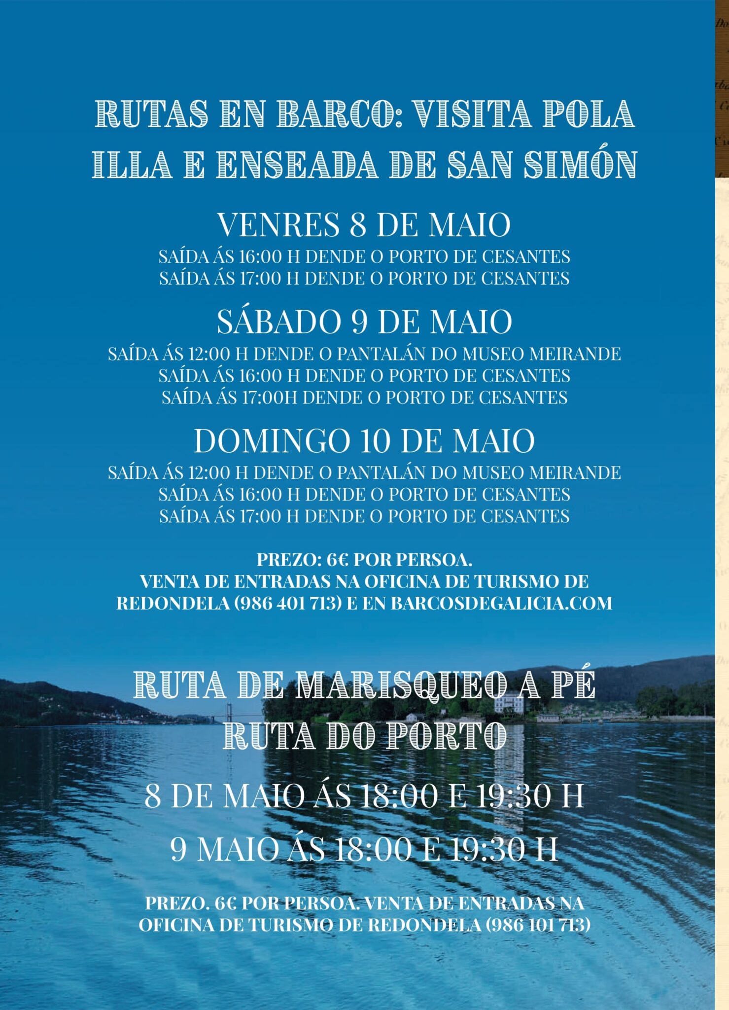 • Rutas Marítimas: Durante os tres días realizaranse visitas en barco pola illa e a enseada de San Simón (6 euros), con saídas dende Cesantes e o Museo Meirande. Ademais, haberá rutas de marisqueo a pé polo porto o venres e sábado pola tarde (6 euros).