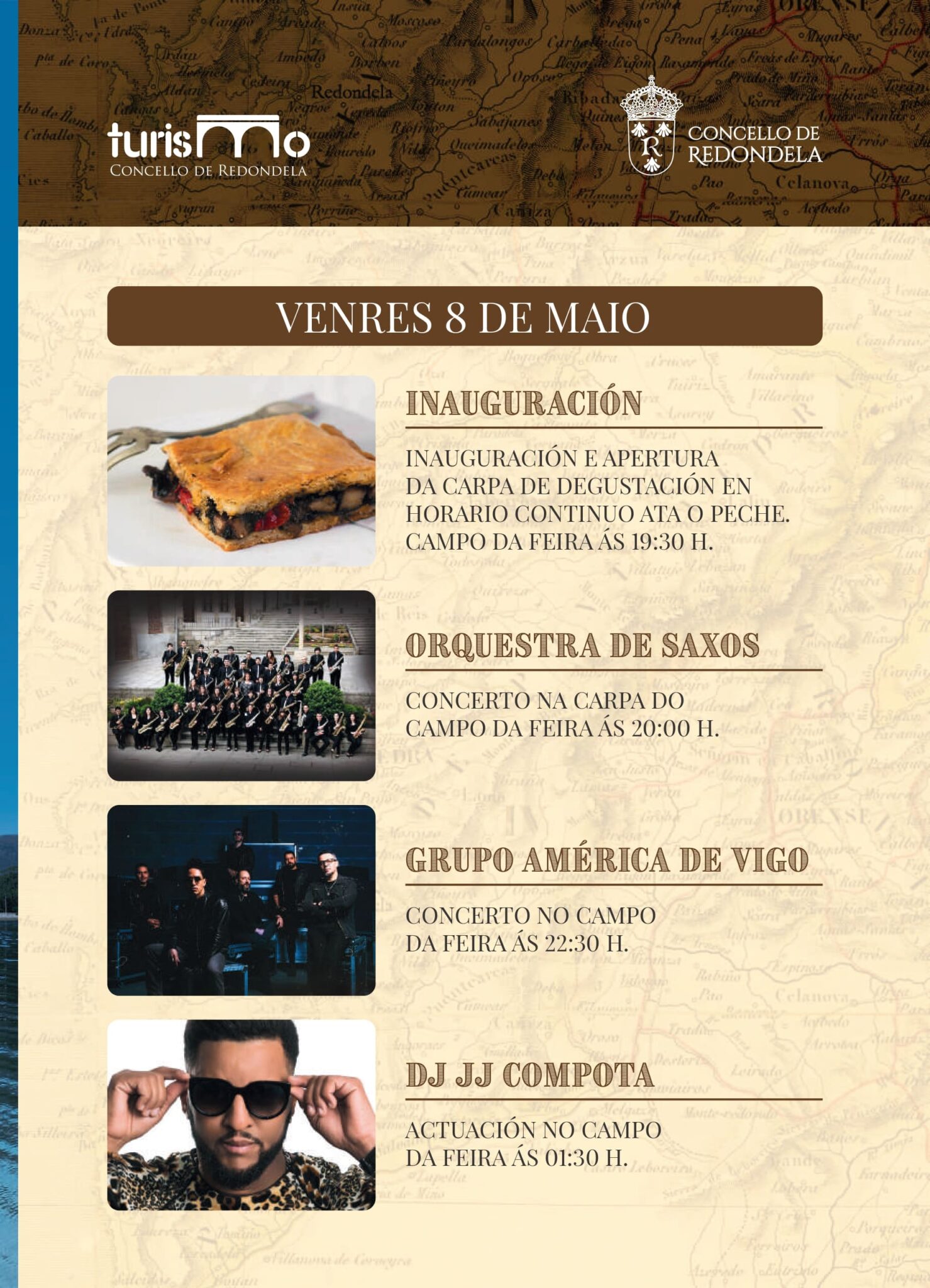 • Apertura da Carpa de Degustación: O venres 8 ás 19:30 h terá lugar a inauguración oficial no Campo da Feira, cun horario continuo ata o peche. Participan os restaurantes Casa Chano, Lugar da Serra, Quinta das Eiras, O Tranquilo, panaderías Vila dos Viaductos e Cruceiro, PaladarQueso, Vilalongo e Embutidos Rodríguez Amoedo. Tamén haberá oco para a artesanía con Artesanía Lelate.