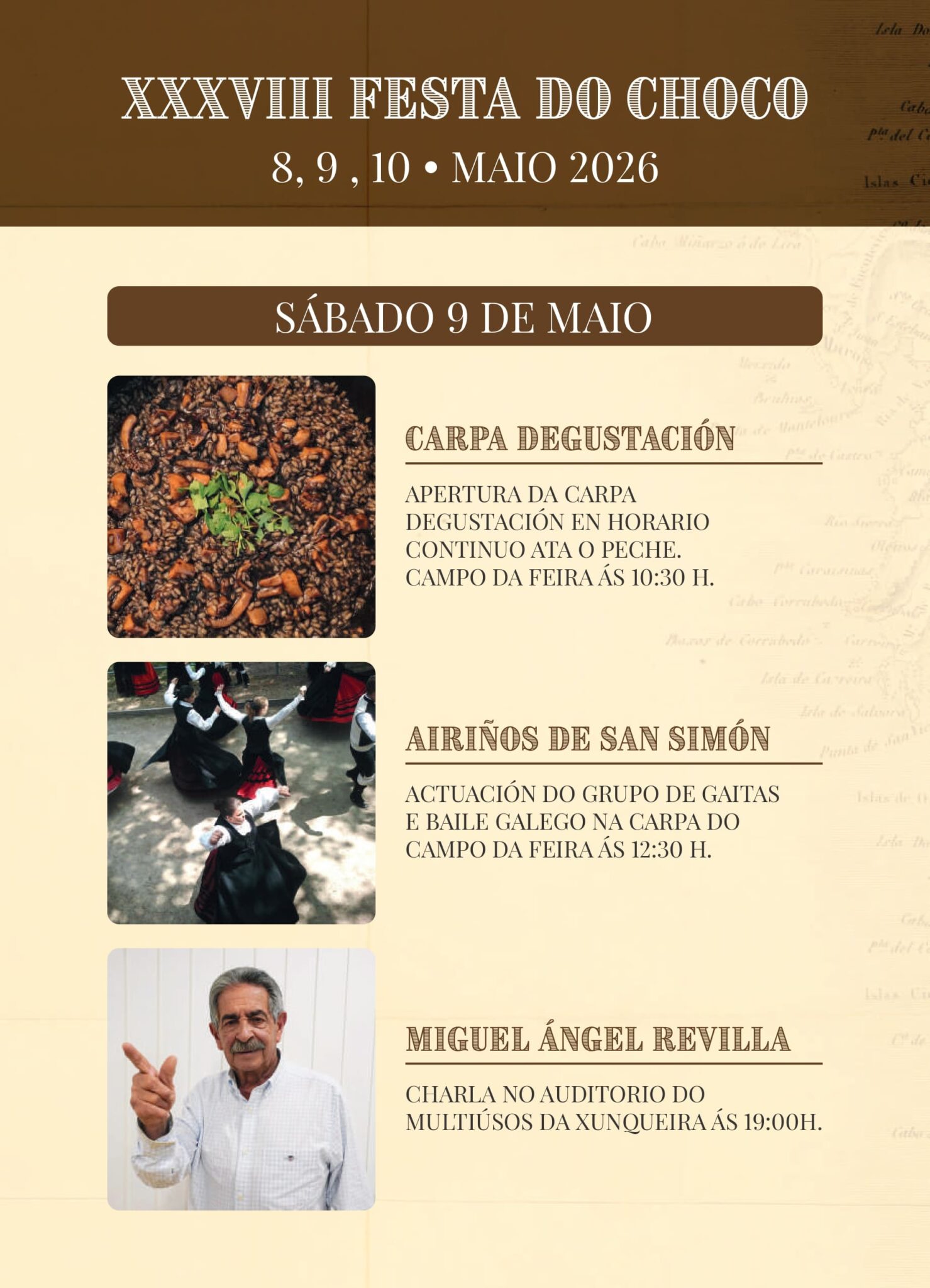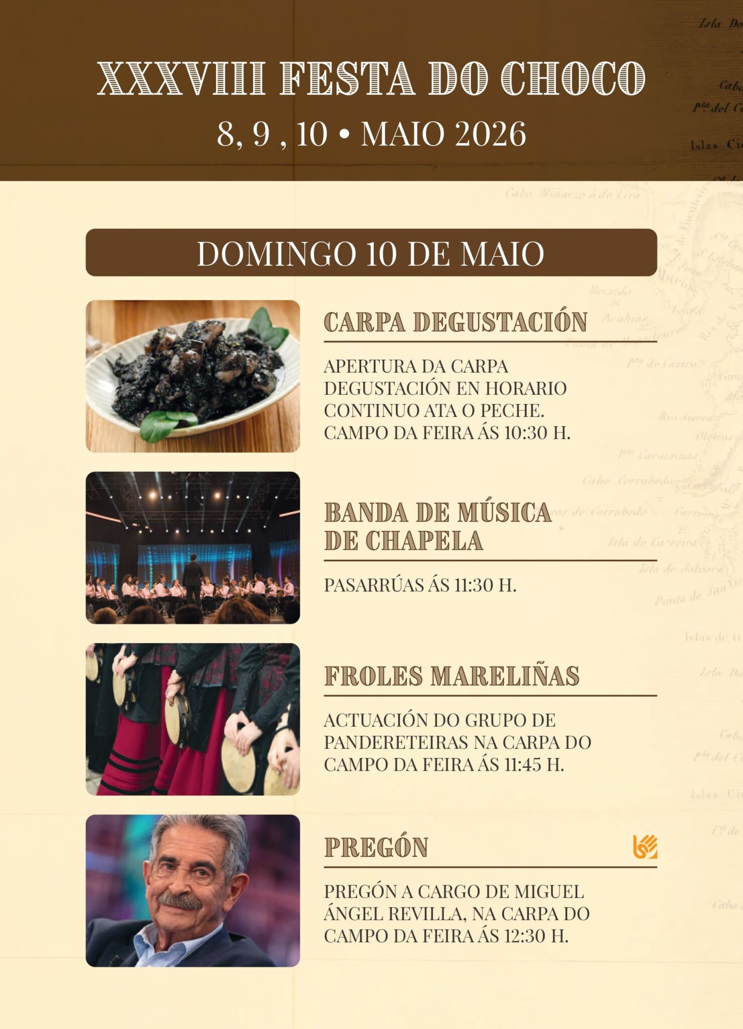 Rivas subliñou que esta edición 2026 “será histórica pola excelencia do produto da nosa Enseada, a atractiva programación e a calidade da oferta musical”. A patroa maior da Confraría, Nisi Otero, confirmou “a extraordinaria calidade do choco esta temporada, con abundantes capturas”. Os establecementos participantes nos postos de degustación da carpa prepararán uns 1.000 quilos de cefalópodo de Redondela en especialidades como choco na súa tinta, á feira, en empanada, á planca ou croquetas de choco.
