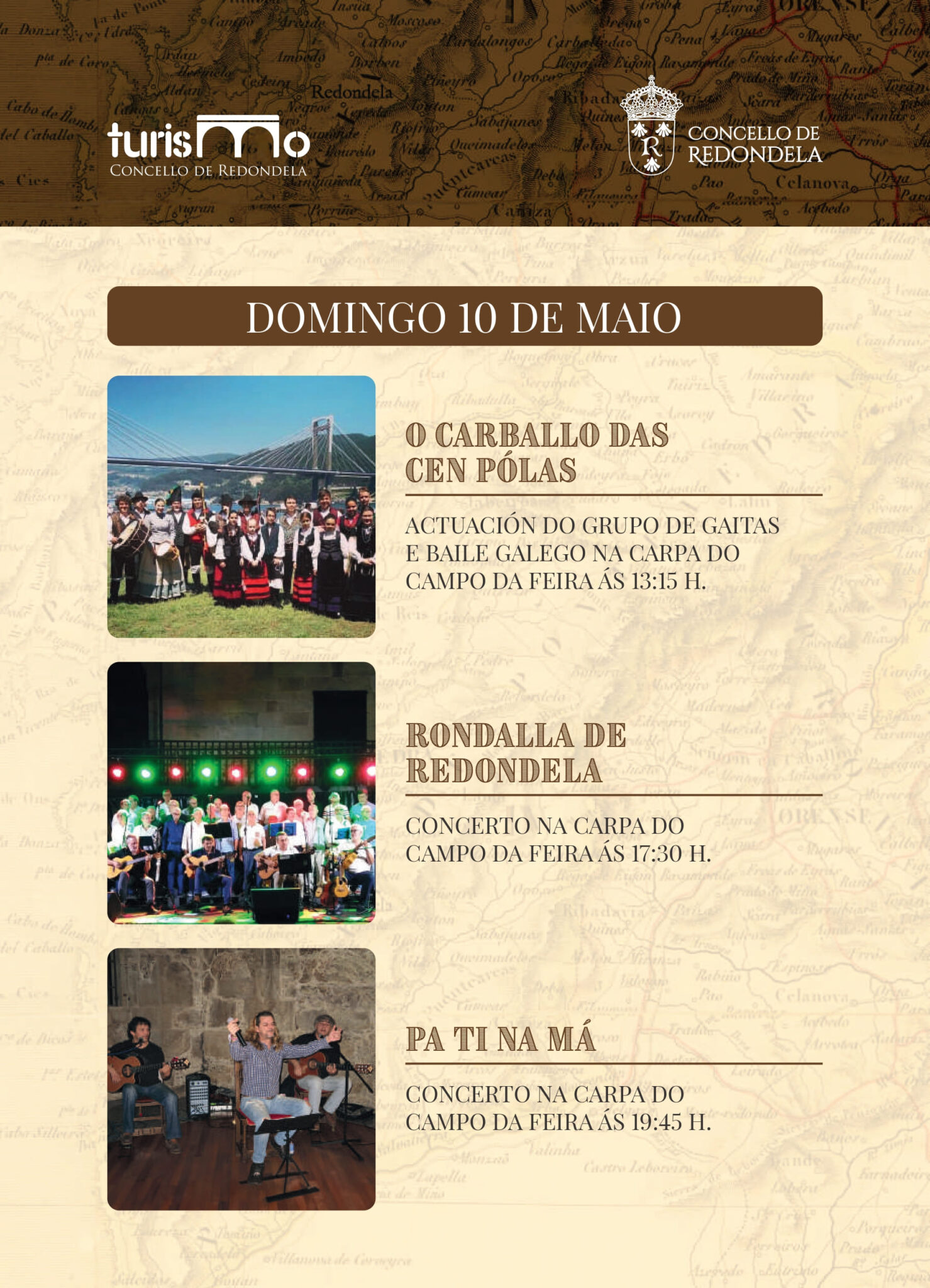 • Domingo 10: Pasarrúas coa Banda de Música de Chapela, pandeireteiras Froles Mareliñas, O Carballo das Cen Pólas, a Rondalla de Redondela (17:30 h) e concerto de peche con Pa Ti Na Má (19:45 h).
