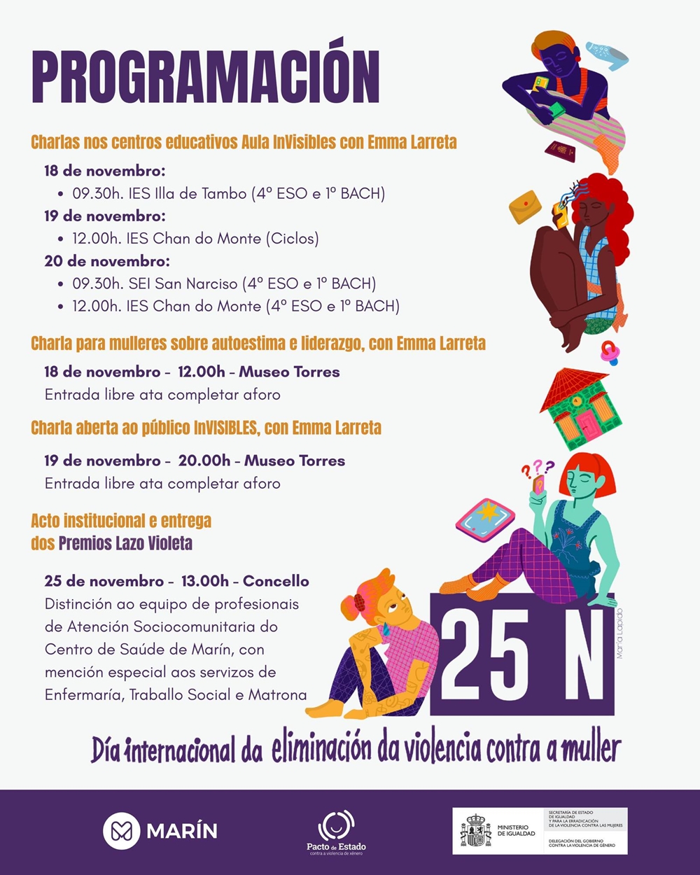 O propio 25 de novembro celebrarase o acto institucional no Salón de Plenos do Concello, ás 13.00 horas, no que se entregará o Premio Lazo Violeta, que este ano porá en valor o traballo do equipo de Atención Primaria que conforma a área de Atención Sociocomunitaria, con especial mención aos servizos de Enfermería, Traballo Social e Matrona.