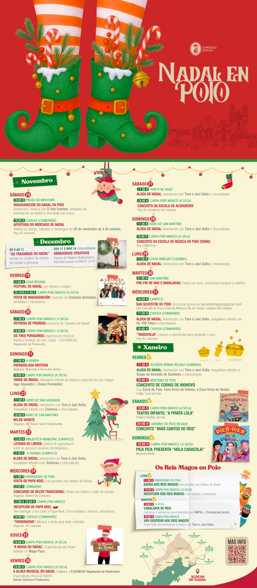 Os Elfos do Nadal de Poio serán o fío condutor para que cada Aldea sexa un lugar máxico con moita animación, música e bailes especiais da man de Javi Solla e Tere que se completarán con actividades de animación na rúa nas que están implicados diferentes colectivos para organizar sesións de teatro, batucadas, obradoiros, contos, panxoliñas, música ou incluso un anticipo das badaladas de fin de ano.