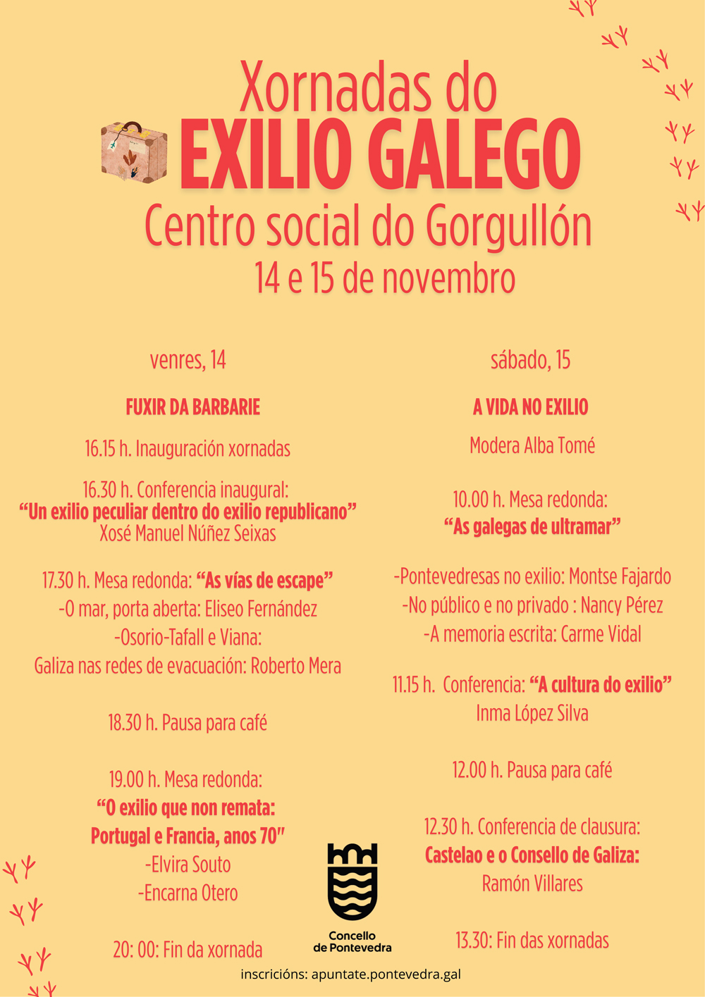 • Os días 14 e 15 de novembro o Centro Social do Gorgullón acollerá as ‘Xornadas do Exilio Galego’ coordinadas por Montse Fajardo e con inscrición xa aberta en apuntate.pontevedra.gal