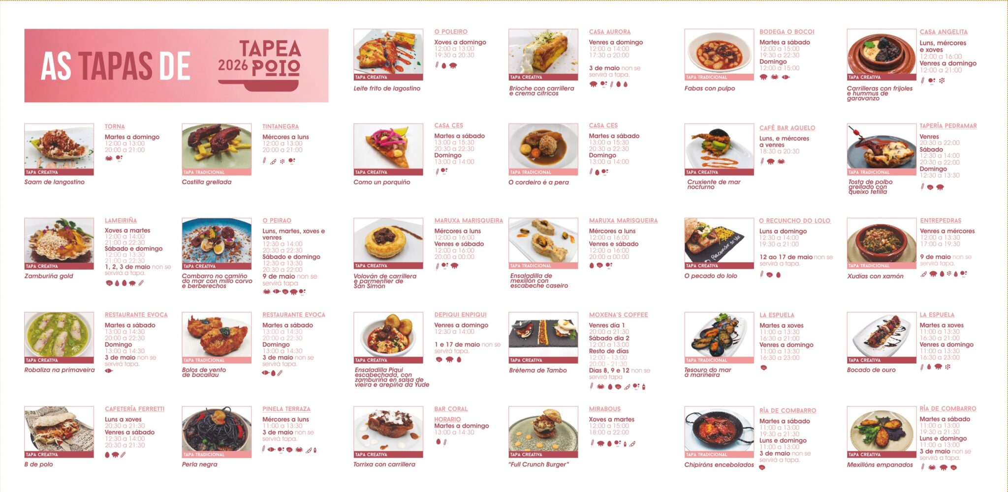 Os 23 establecementos participantes ofrecerán un total de 28 tapas -18 en modalidade creativa e 10 en modalidade tradicional- a un prezo único de 4 euros por tapa.