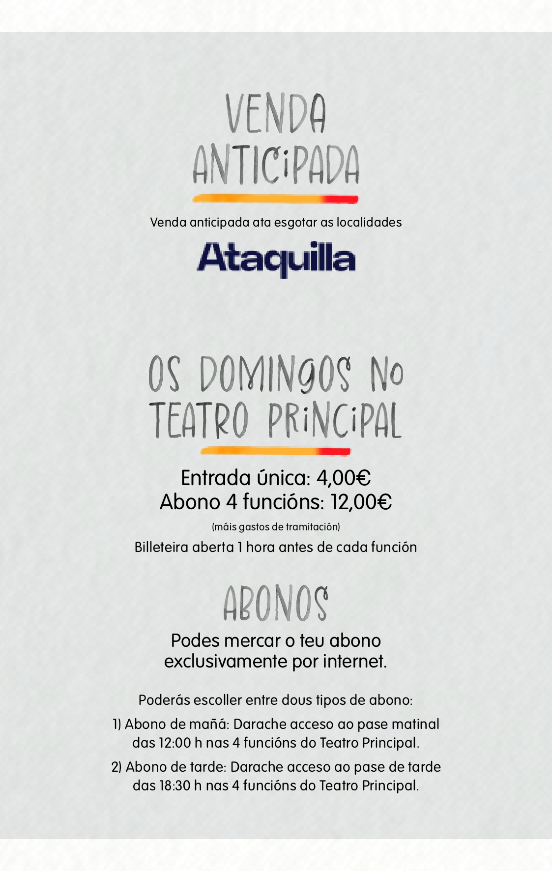 • As entradas e abonos para os pases das 12 e as 18.30 horas dos domingos 11, 18 e 25 de xaneiro e 1 de febreiro están á venda en Ataquilla.com