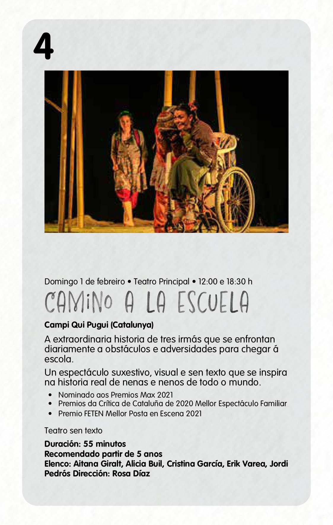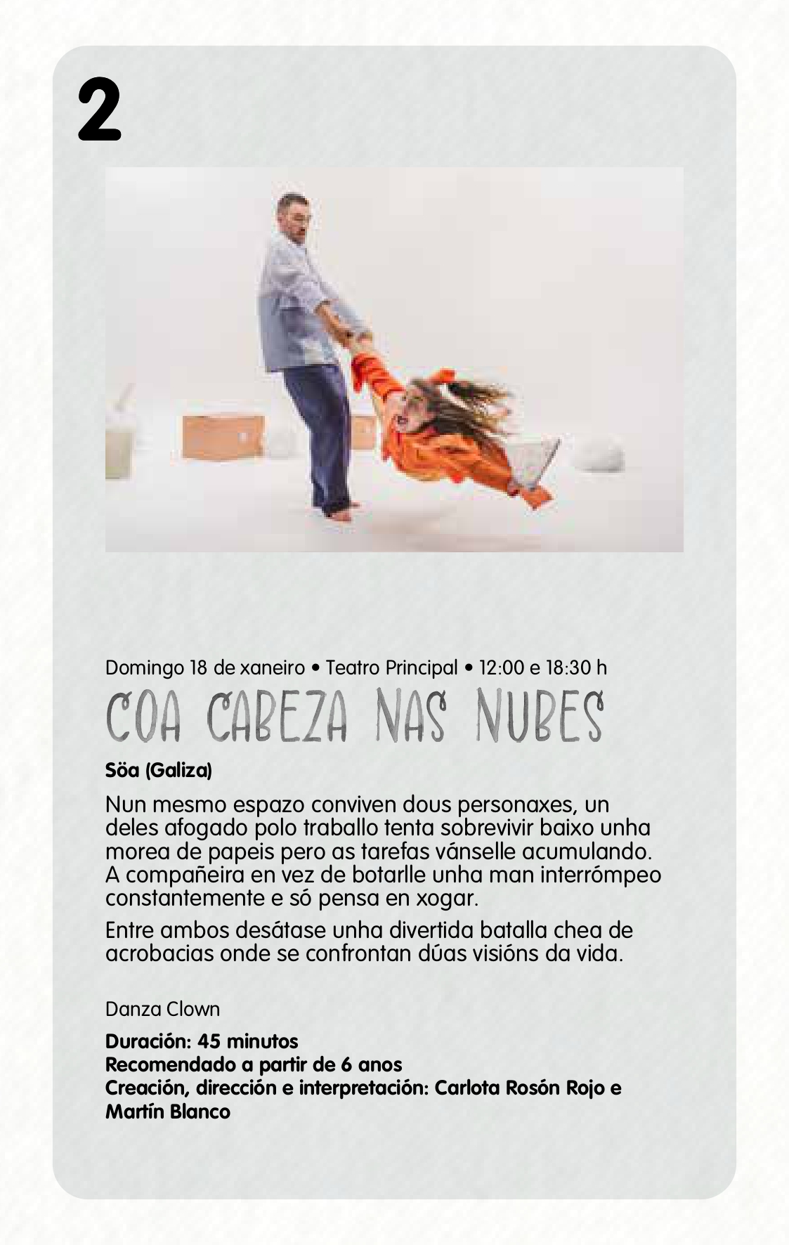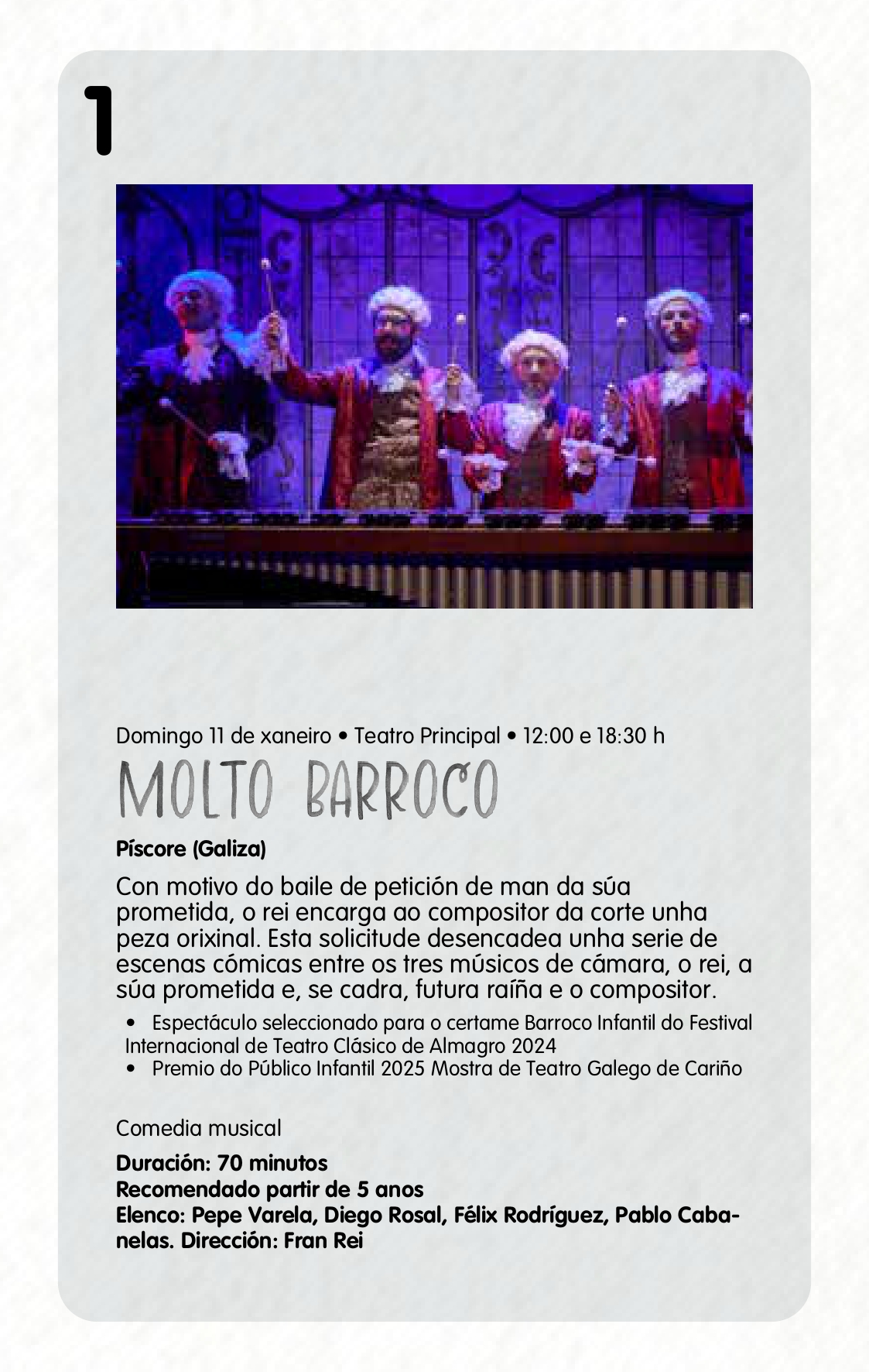 Entre a programación, no que atopamos espectáculos de diferente natureza e temáticas como a hiperactividade, a igualdade, as aventuras de 3 irmás camiño á escola, etc. Cabe sinalar o primeiro espectáculo que chegará o 11 de xaneiro, ‘Molto Barroco’ de Píscore, que tivo que ser cancelado na edición anterior”.