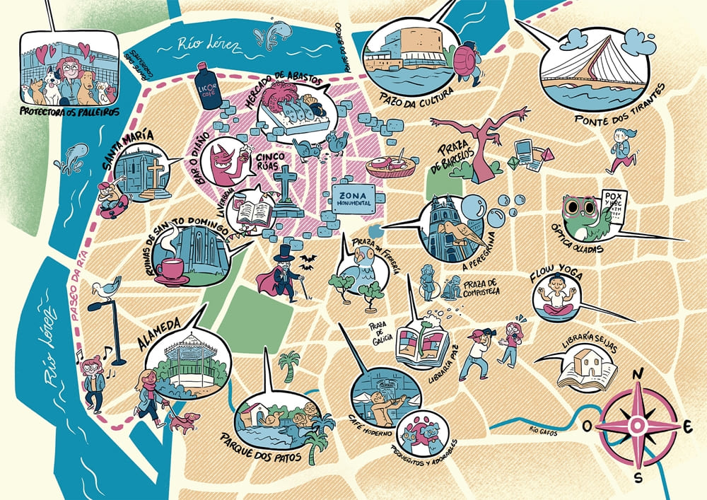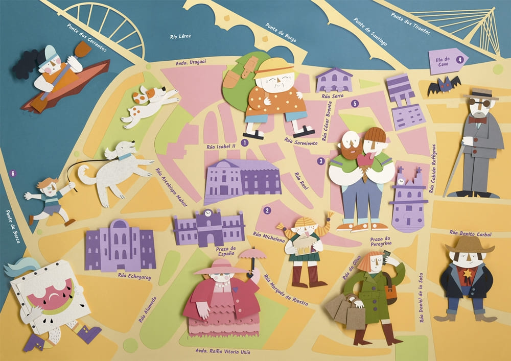 Aida Alonso, que traballa coa técnica de recortes de papel, centrouse no vínculo afectivo que creou coa cidade durante a súa etapa de estudante de Belas Artes. O seu mapa destaca non só lugares especiais, senón tamén a “habitantes da propia cidade” e personaxes con personalidade propia que lle chamaron a atención.