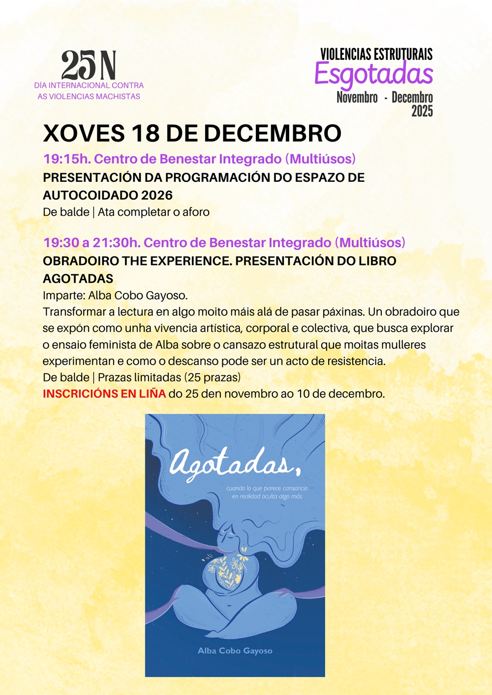 Neste 25N tal e como dixo a directora do CIM, Cristina García, “faremos un percorrido pasando por diferentes tipos de violencias estruturais como no seu día puido ser a psiquiatría como utilización de control ás mulleres a través do relatorio que vaia a facer Carmen V. Valiña e o obradoiro ‘The Experience’, de Alba Cobo, co libro ‘Agotadas’, onde se fala xustamente de todas estas violencias estruturas que exercen unha opresión importante e unha sobrecarga para as mulleres que as leva a estados de esgotamento físico e psicolóxico”.