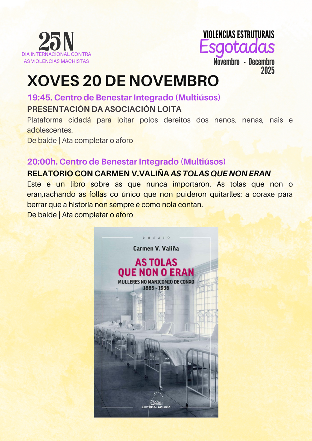 Un 25N que terá a súa programación no Centro de Benestar Integrado (Multiúsos) e que comezará o 20 de novembro, ás 20:00h, co relatorio anteriormente citado, ‘As tolas que non eran’ de Carmen V. Valiña.